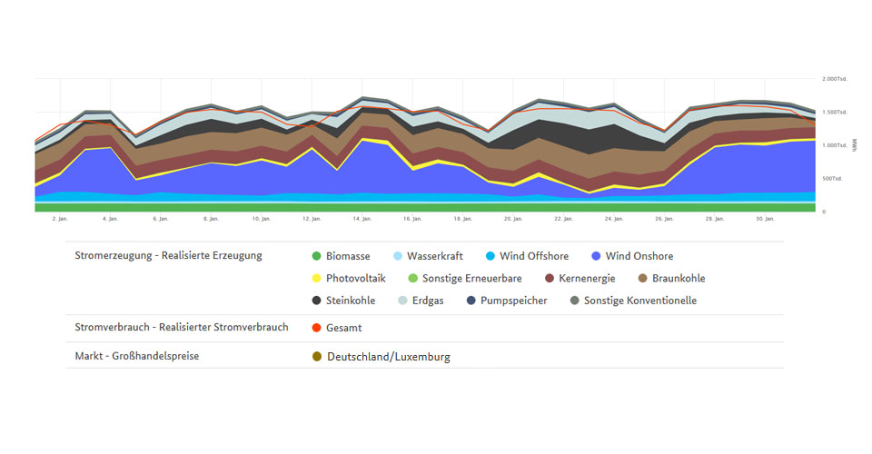 Am Mittwoch, den 8. Januar erreichte die gesamte Stromerzeugung zwischen 11.00 und 12.00 Uhr ihr Maximum von 79,3 GWh und lag damit 4,9 Prozent unter dem Maximalwert des Vorjahresmonats. Zur geringsten Stromerzeugung des Monats in Höhe von 37,6 GWh kam es am Mittwoch, den 01. Januar zwischen 01.00 und 02.00 Uhr.